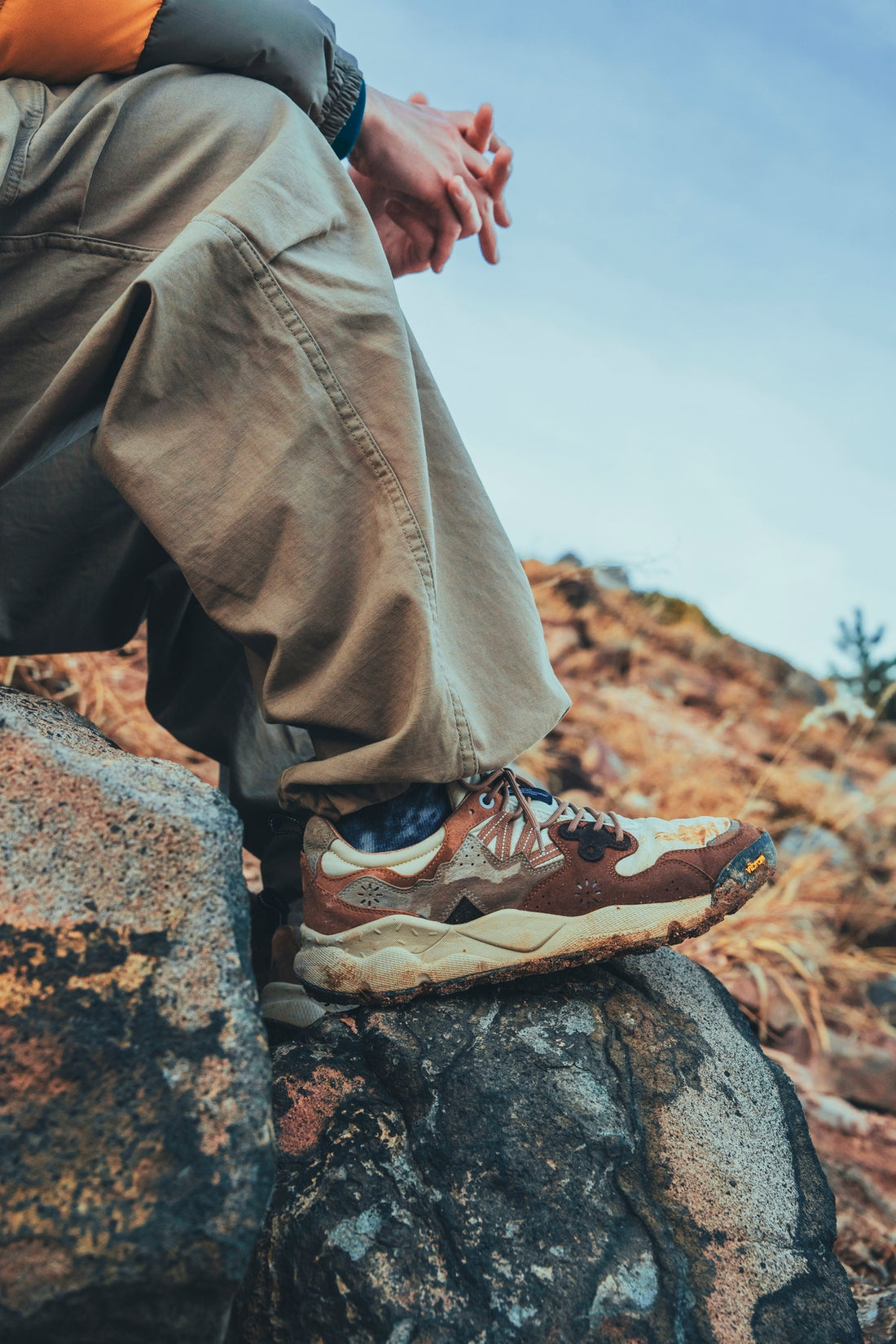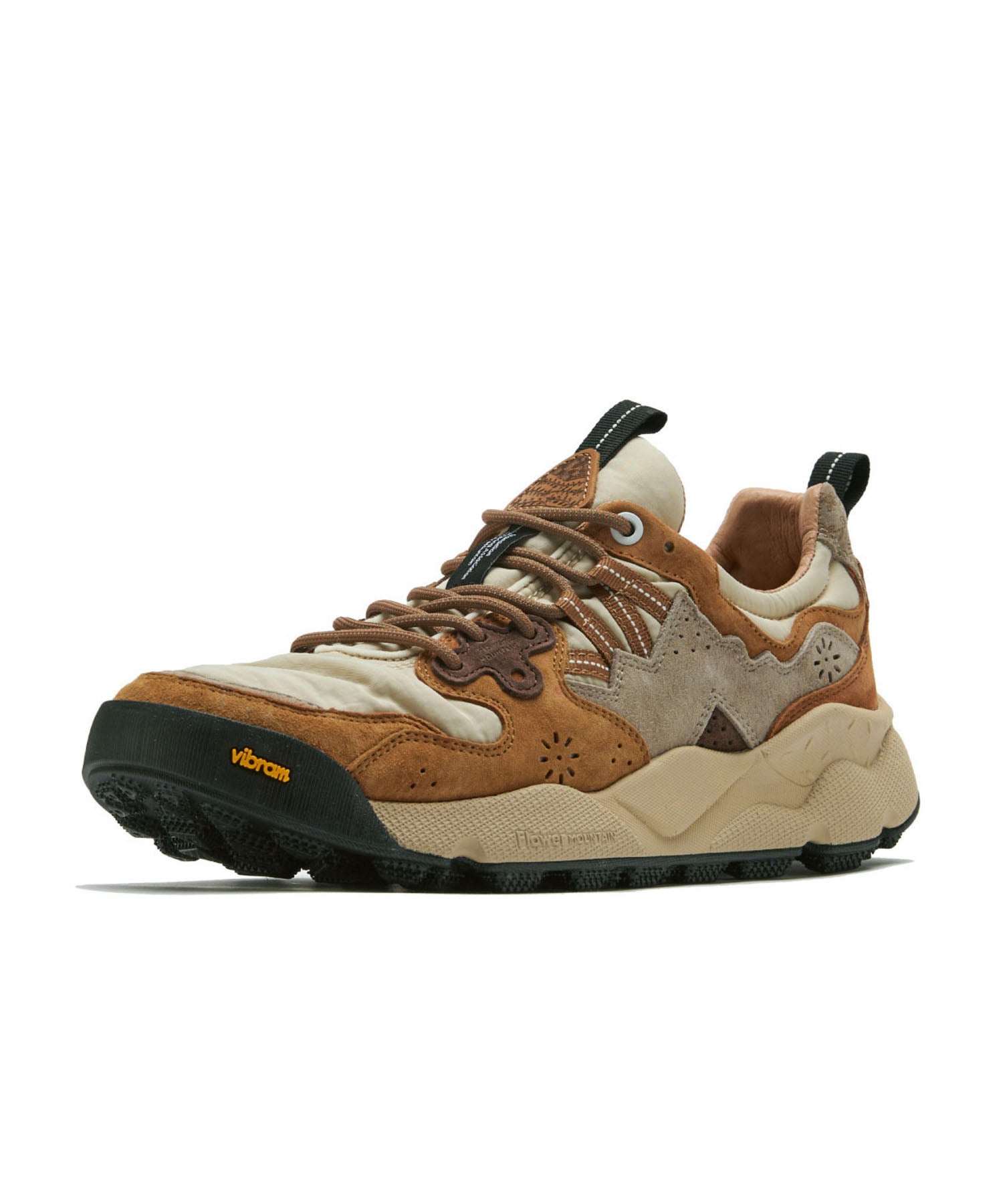 スニーカーの印象を特徴づけるサイドのデザインはのコンセプトである山、ナンガ パルパットの稜線を模したデザインラインを採用。踵部には”NANGA”の刻印が施され、アイレットステイとシュータンにはヌメ革のFlower MOUNTAINのモチーフを配し、両ブランドのアイコニックなDNAが1足の中に凝縮されたデザインとなっている。